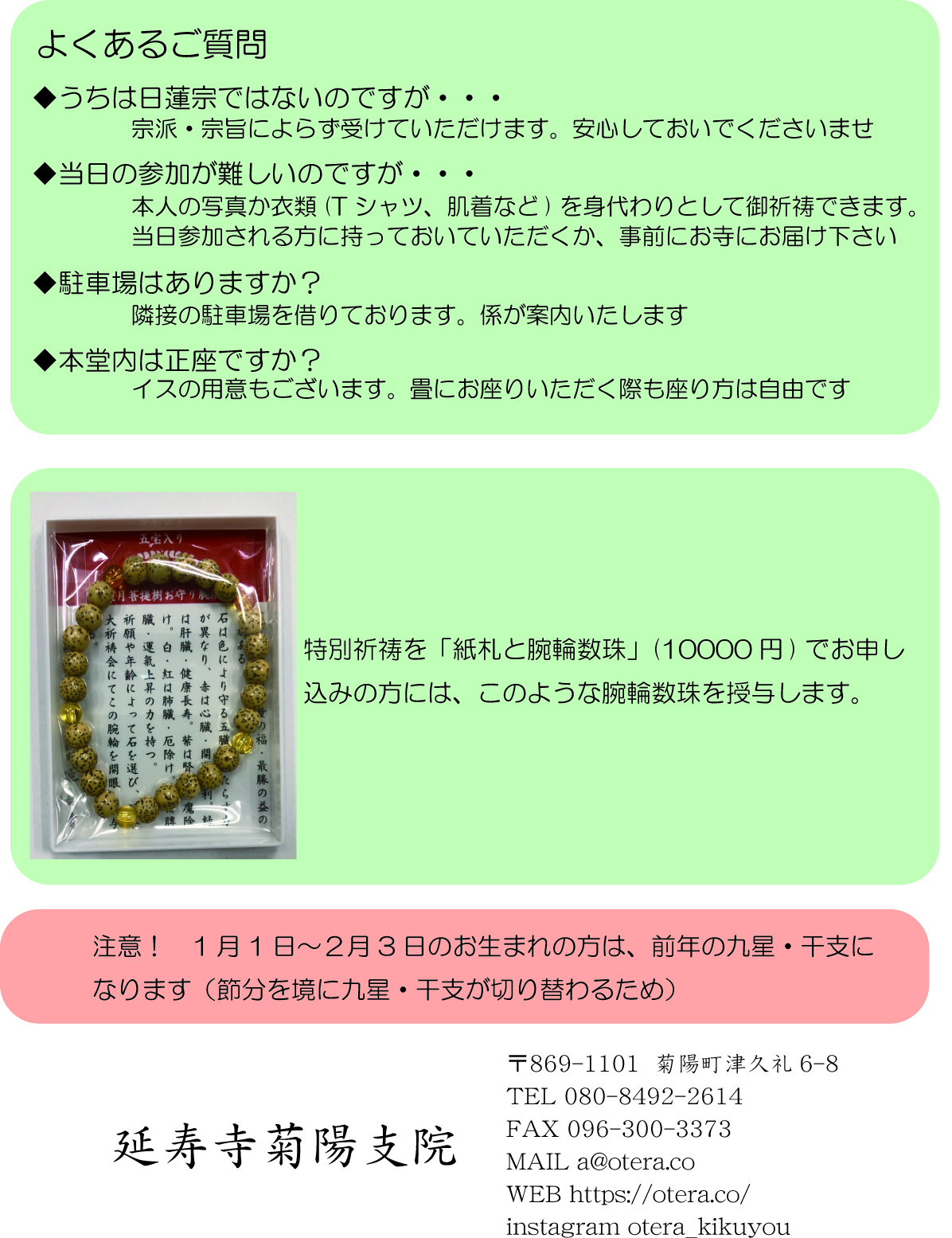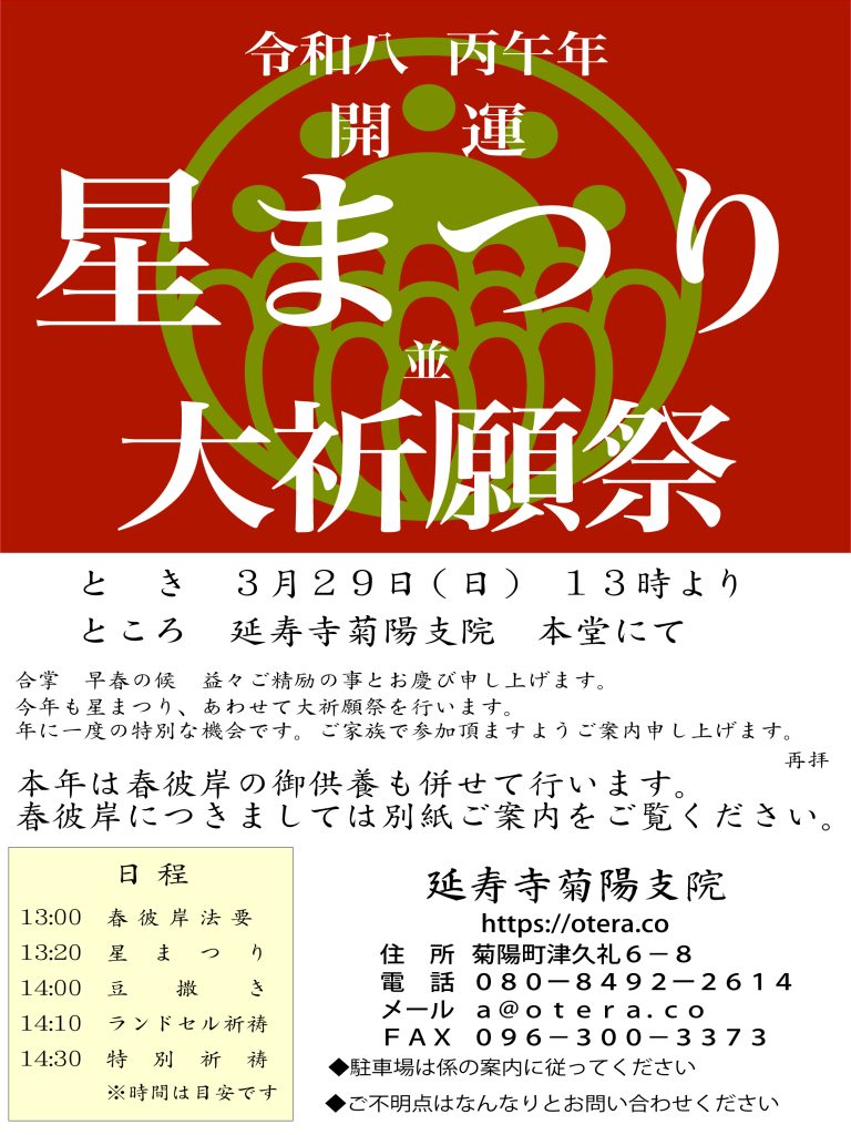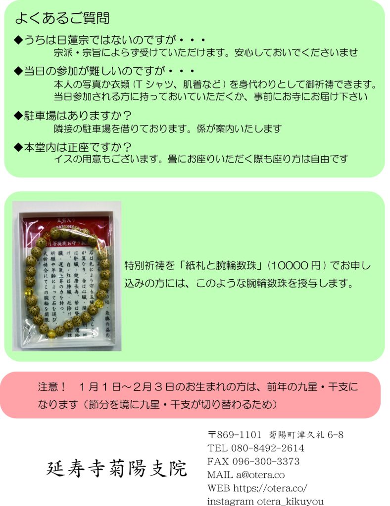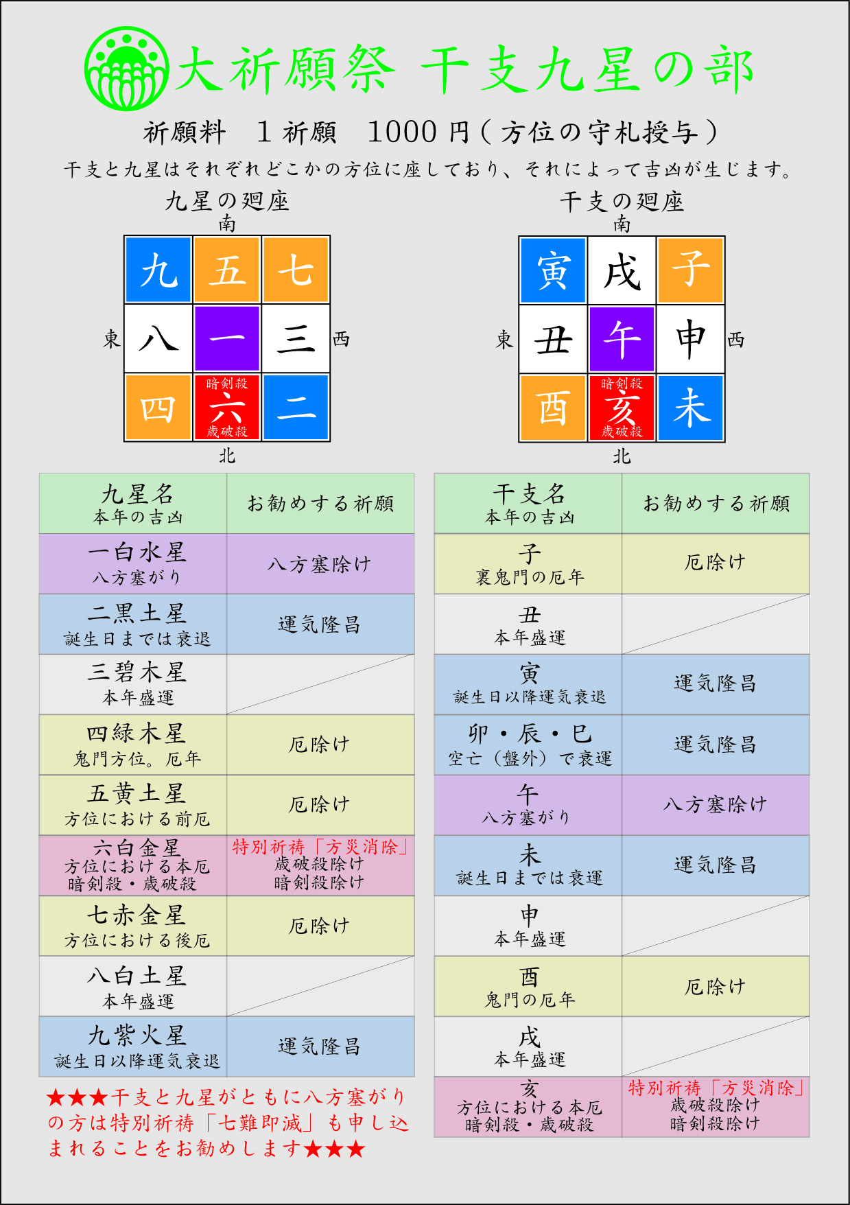 全員に関係する開運・厄除けのご祈祷については「星まつり」と「干支・九星」のご祈祷でおしまいです。