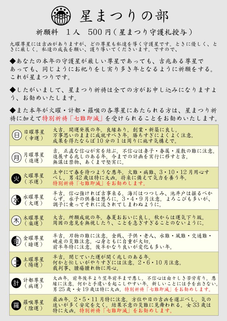 星まつりの「星」とは、年代わりで私達を護り導く9つの守護星のことです。