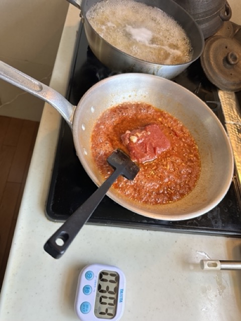 慌ててトマトを投入。はたして茹で上がりまでにトマトは融けるのか。できれば水分と酸味がある程度飛ぶまで炒めたいが、間に合うのか!?