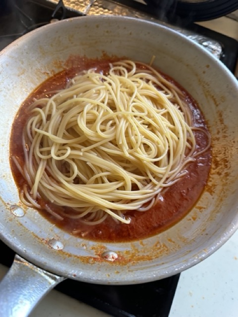 タイマー、ソース、パスタを同時に見ながらの戦いが始まりました。